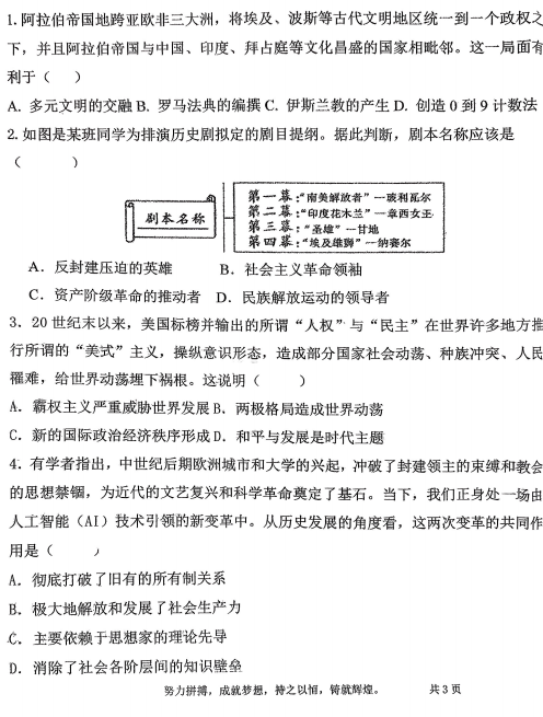 山东省鄄城县凤凰镇凤凰学校2025-2026学年九年级上学期1月月考历史试题