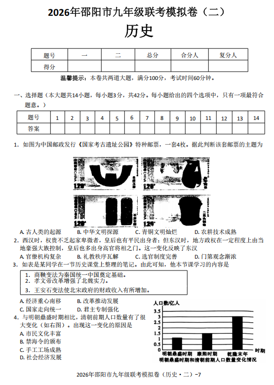 湖南省邵阳市2025-2026学年九年级上册联考二模历史试卷