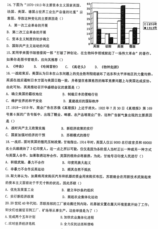 山东省济宁市嘉祥县疃里镇二中2025-2026学年九年级上学期元旦假期开学学业检测九年级历史试卷