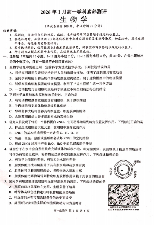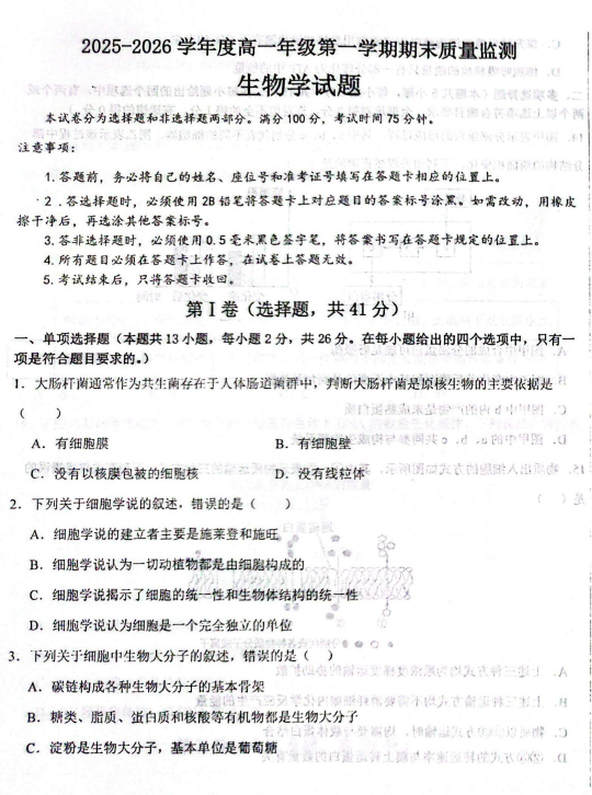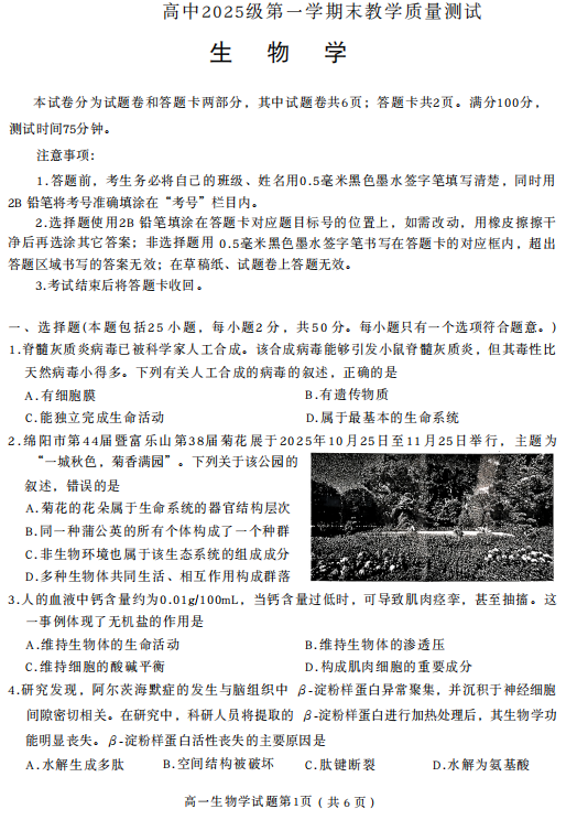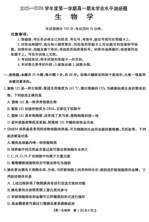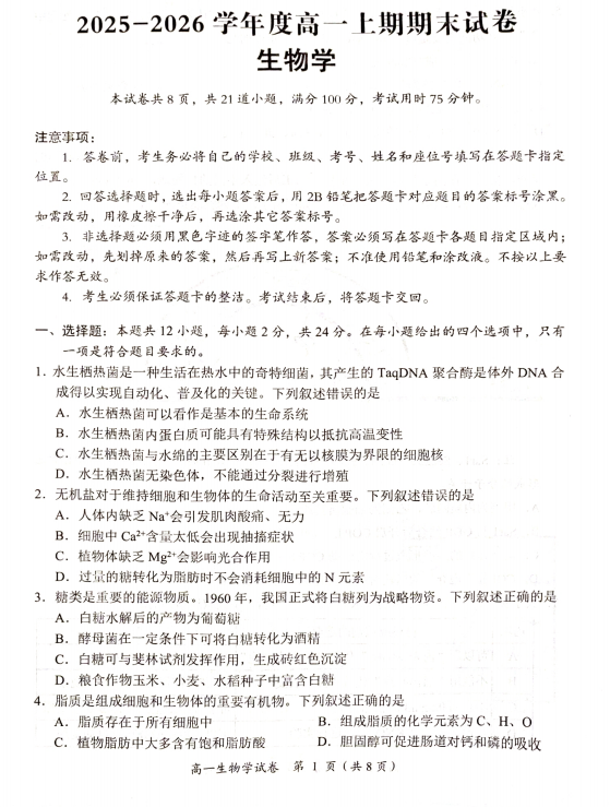 2025-2026学年高一第一学期末教学质量测试生物学试题