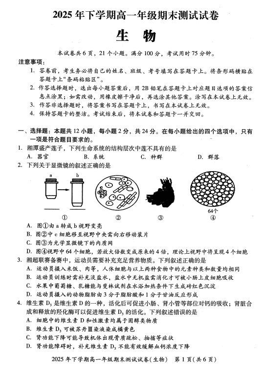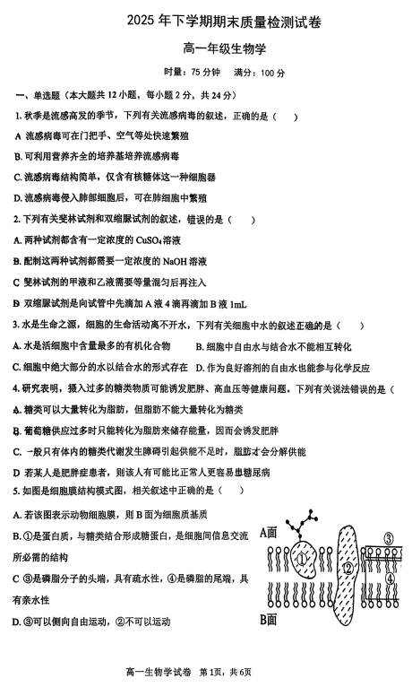 2025-2026学年高一上学期1月期末生物试题