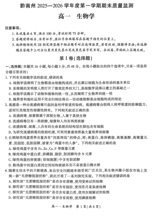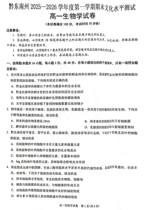 黔东南州2025—2026学年高一上学期生物期末考试生物试题