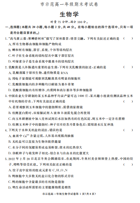 2025-2026学年度高一年级第一学期期末质量监测生物学试题