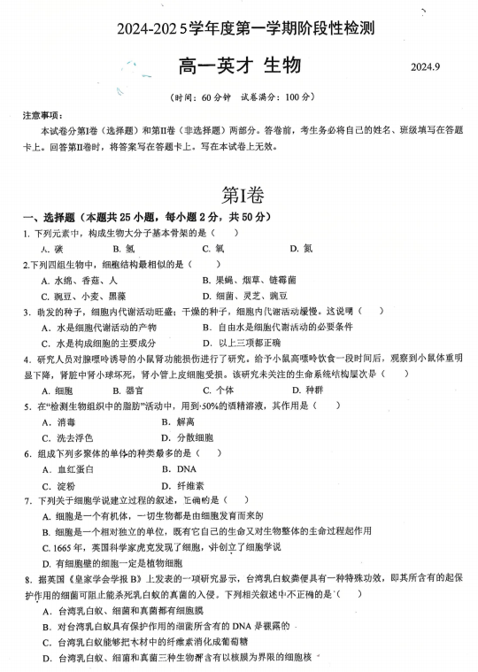 2025-2026学年高一上学期9月月考生物试题