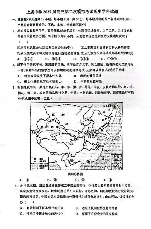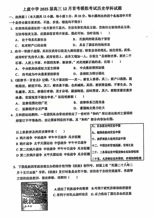 浙江省绍兴市上虞区上虞中学2024-2025学年高三上学期12月首考模拟考试历史试题
