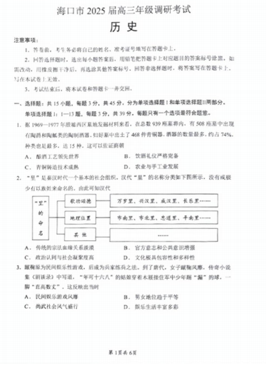 海南省海口市2024-2025学年高三上学期期末考试历史试题