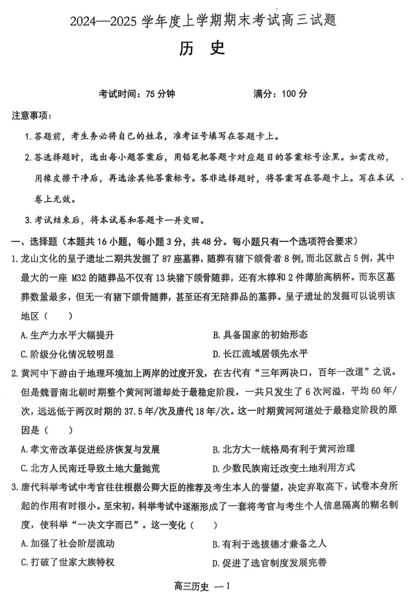 辽宁省普通高中2024-2025学年高三上学期期末考试历史试题