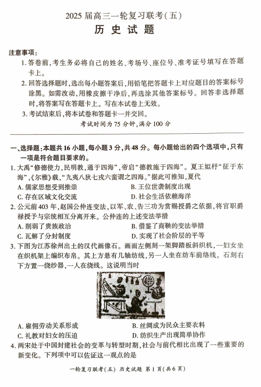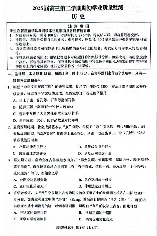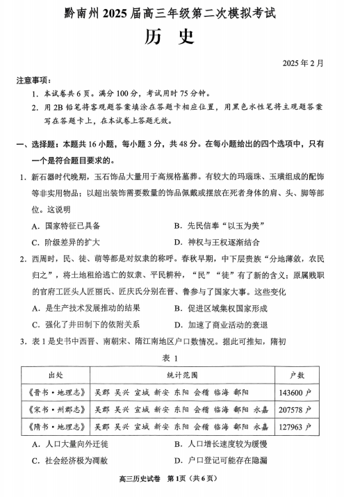 2025届贵州省黔南布依族苗族自治州高三下学期第二次模拟考试历史试题