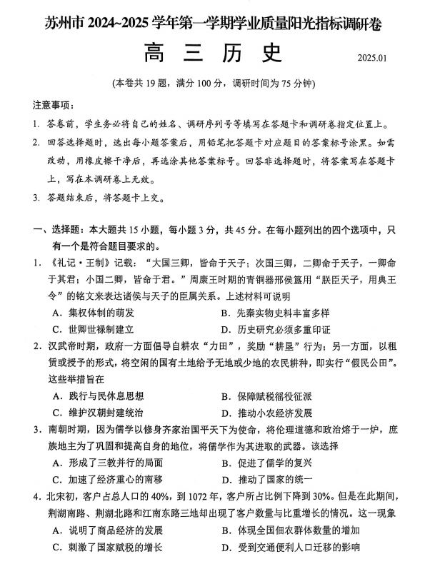 江苏省苏州市2024-2025学年高三上学期期末质量调研历史试题