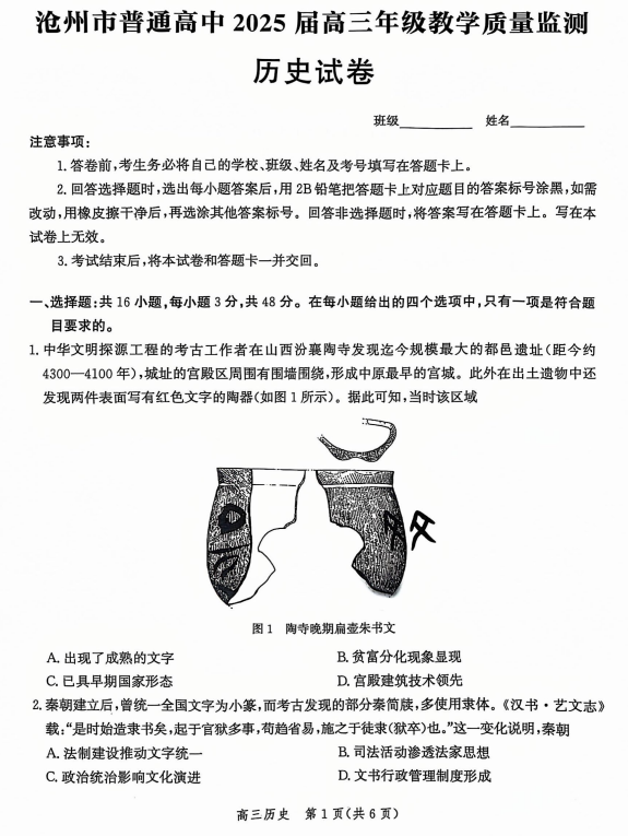 河北省沧州市2024-2025学年高三上学期12月教学质量监测历史试题