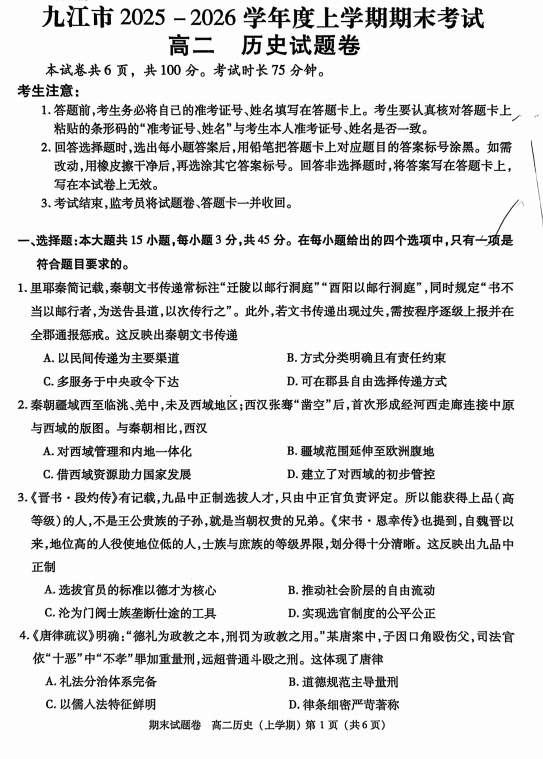 九江市2025-2026学年高二上学期期末考试历史试题