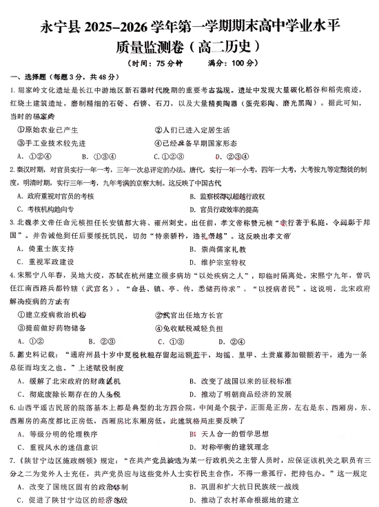 永宁县2025-2026学年高二上学期期末学业水平质量监测历史试卷