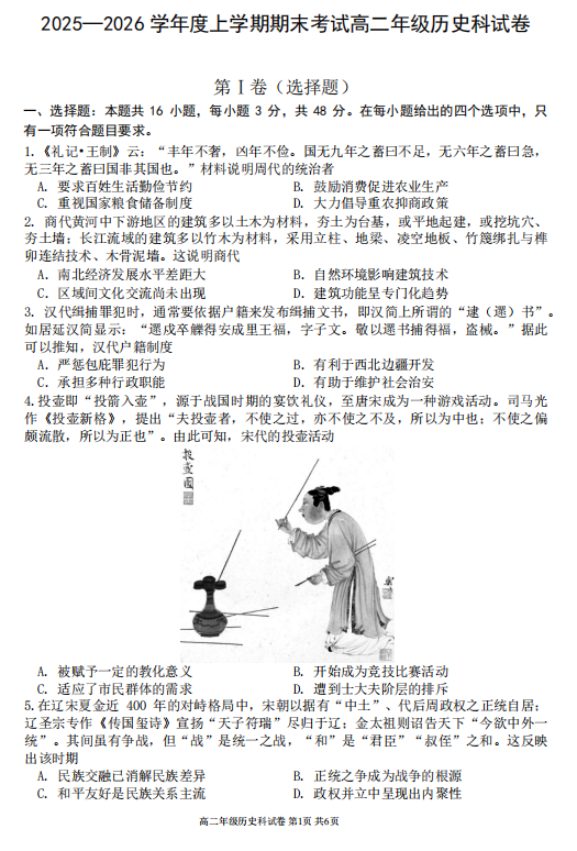 2025-2026学年高二上学期期末质量监测历史试题