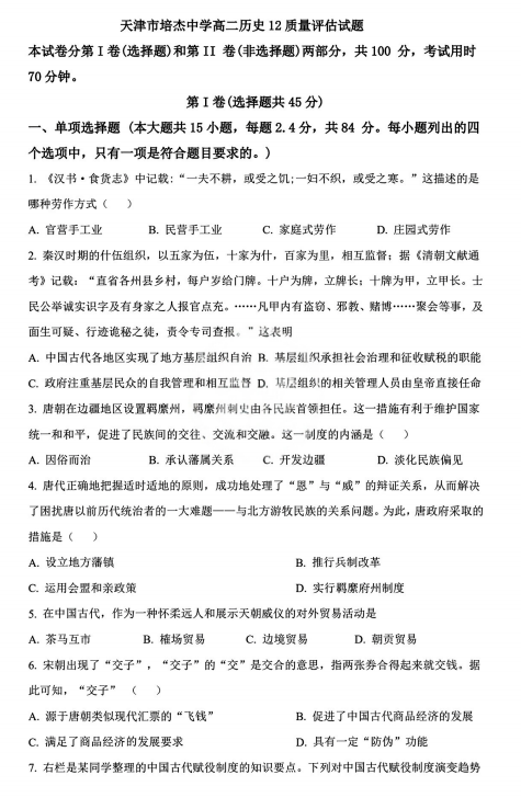 天津市培杰中学2025-2026学年高二上学期12月质量评估历史试题