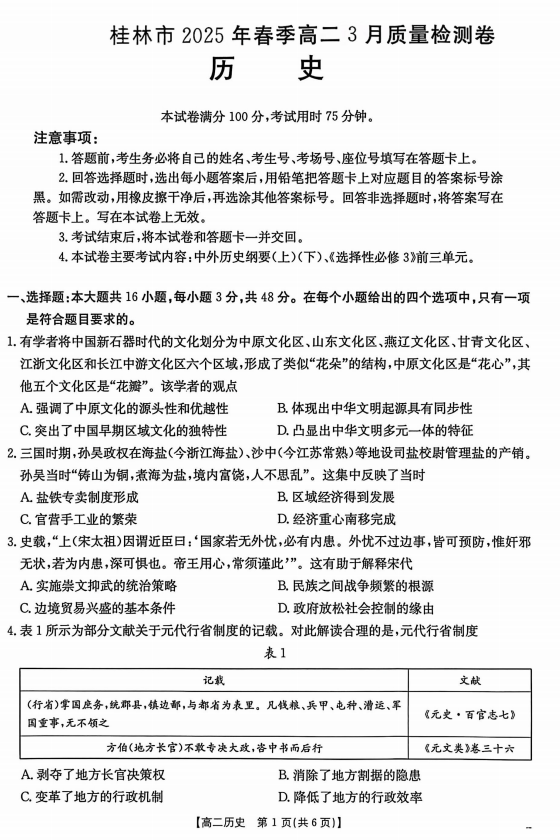 广西壮族自治区桂林市2024-2025学年高二下学期3月质量检测历史试卷