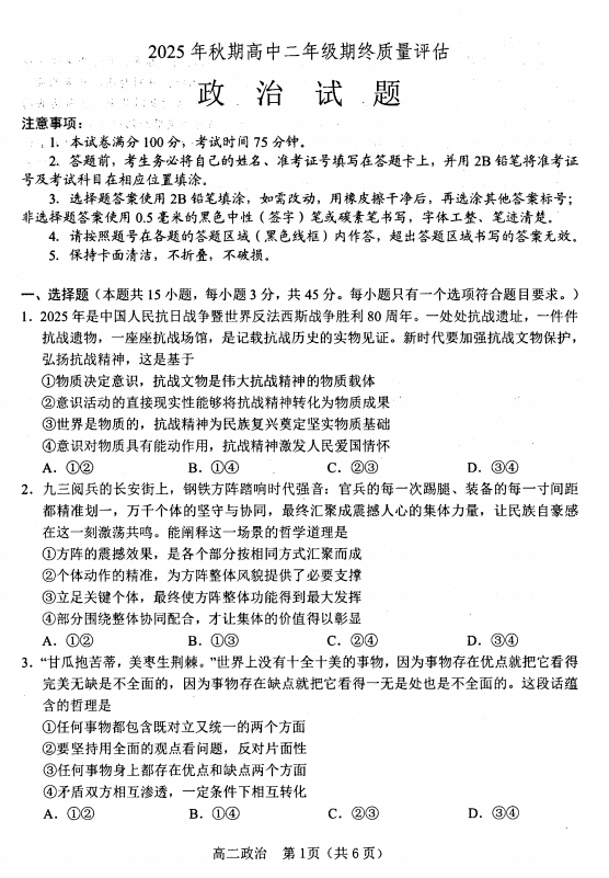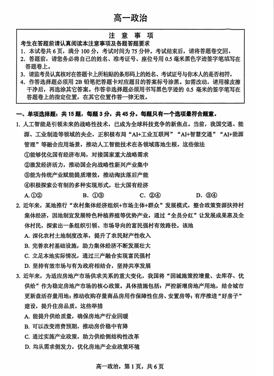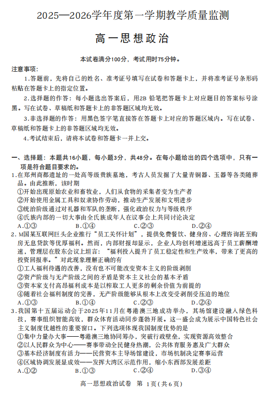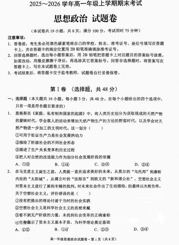 2025-2026学年高一年级上学期2月期末考试政治试题
