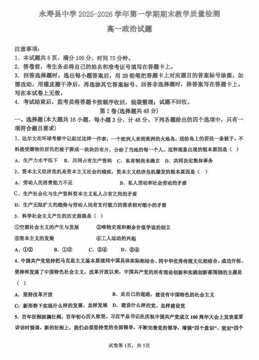 陕西咸阳市永寿县中学2025-2026学年度第一学期期末质量检测高一政治试题