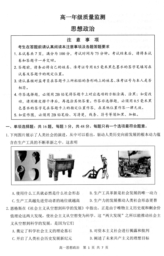 湖北省直辖县级行政单位2025-2026学年度第一学期教学质量监测高一思想政治