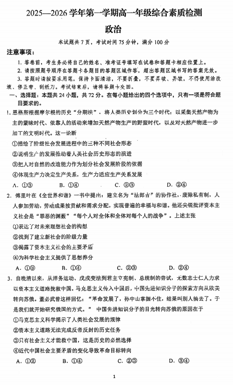 广东肇庆市2025-2026学年第一学期高一期末综合素质检测政治试卷