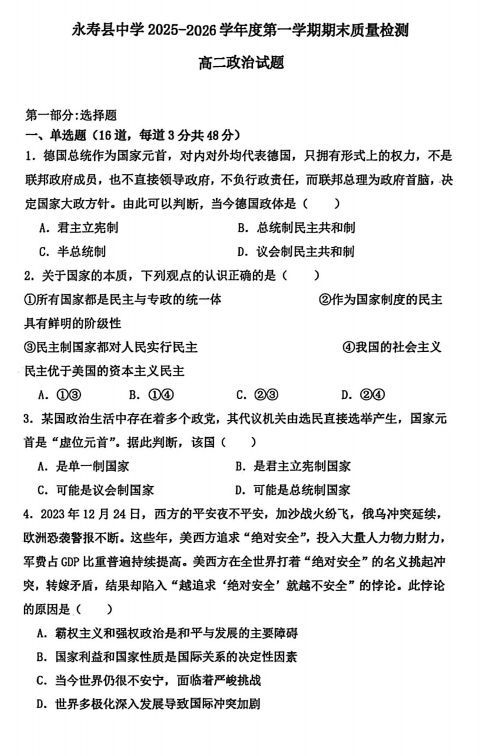 陕西咸阳市永寿县中学2025-2026学年第一学期期末质量检测高二政治试题