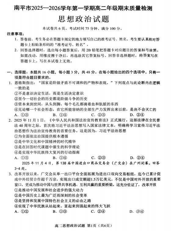 福建南平市2025-2026学年第一学期高二期末质量检测政治试题