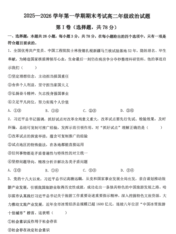 河北石家庄市赵县中学等校2025-2026学年上学期期末考试高二政治试题