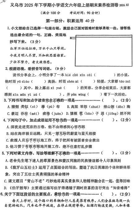 浙江金华市义乌市2025年下学期小学语文六年级上册期末素养检测卷2026.02