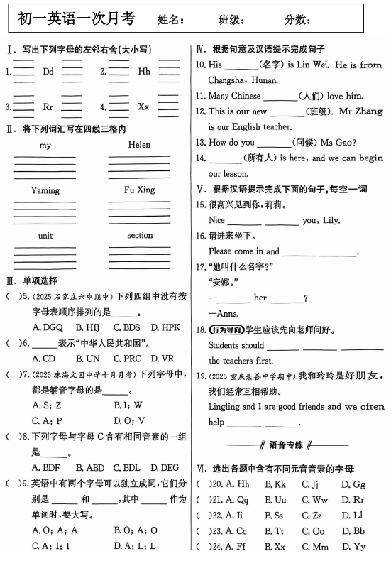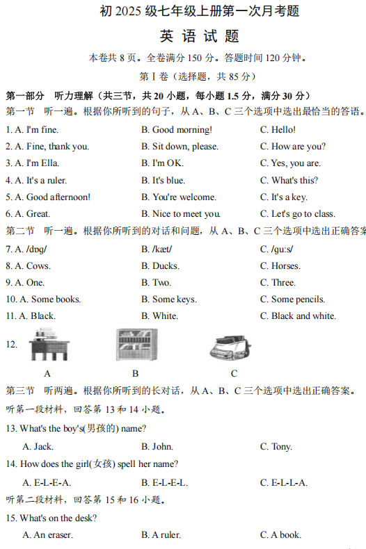 四川省资阳市安岳中学2025-2026学年七年级上学期第一次月考英语试题
