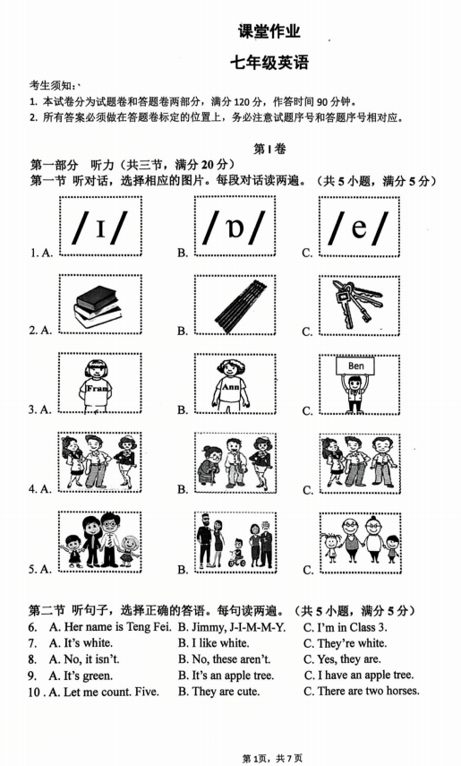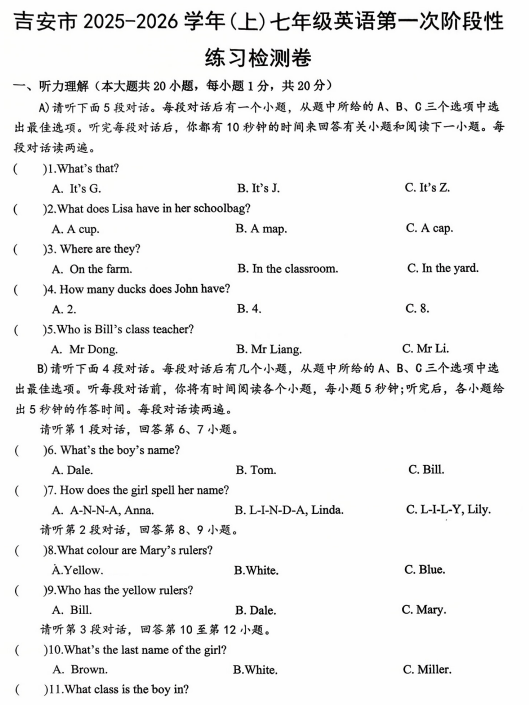 江西省吉安市遂川县思源实验学校2025-2026学年七年级上学期阶段性一练习检测英语试卷
