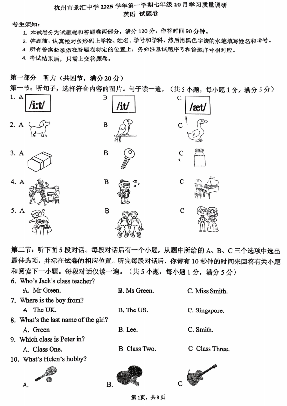 浙江省杭州市景汇中学2025-2026学年七年级上学期10月英语月考试题