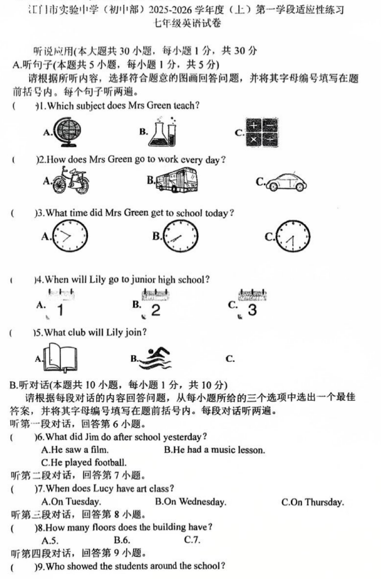 广东省江门市实验中学(初中部)2025-2026学年七年级上学期第一次月考英语试题