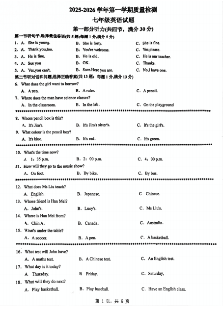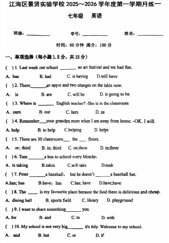 广东省江门市江海区景贤实验学校2025-2026学年七年级上学期第一次月考英语试题