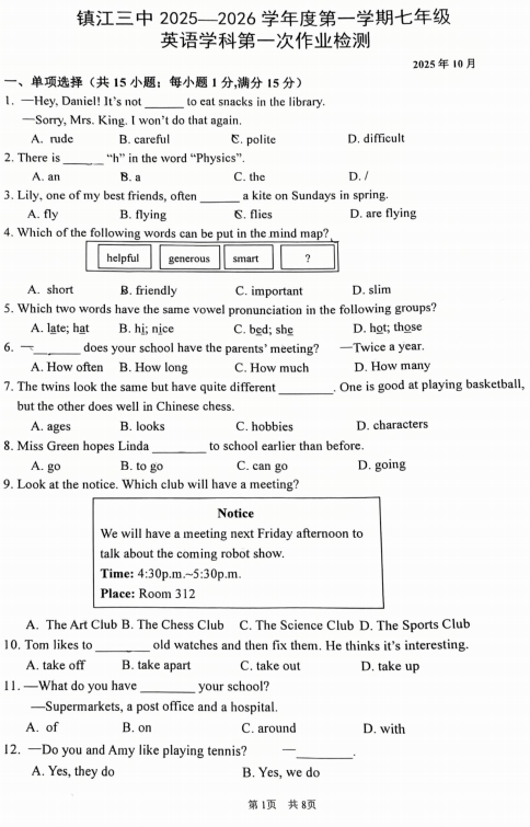 江苏省镇江市第三中学2025-2026学年七年级上学期第一次月考英语试卷