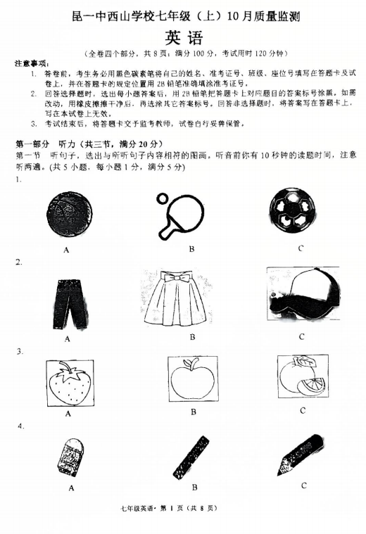 云南省昆明市第一中学西山学校校2025-2026学年七年级上学期第一次月考英语试卷