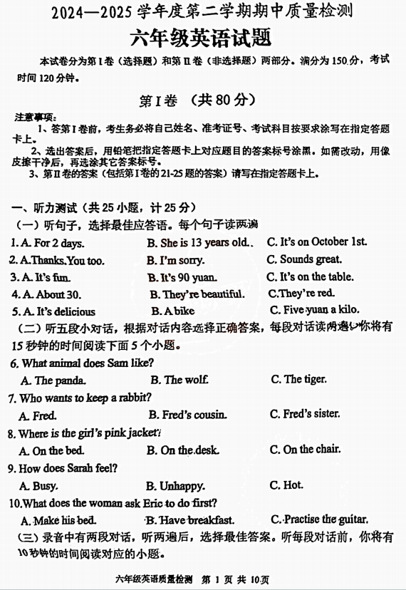 山东泰安市东平六年级下学期期中考试英语试题