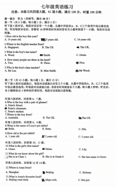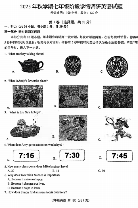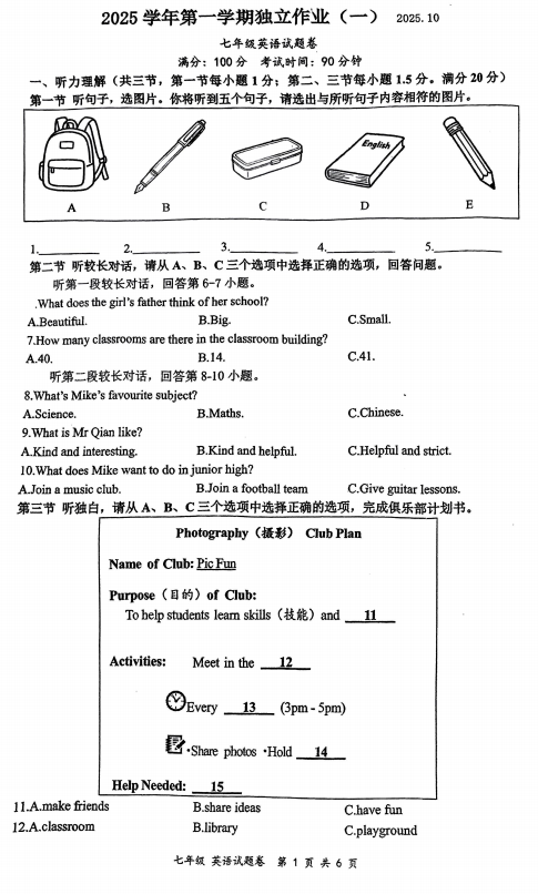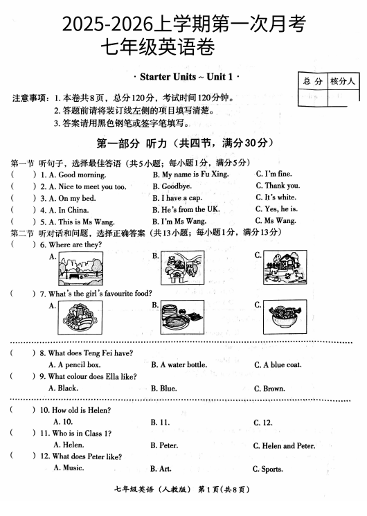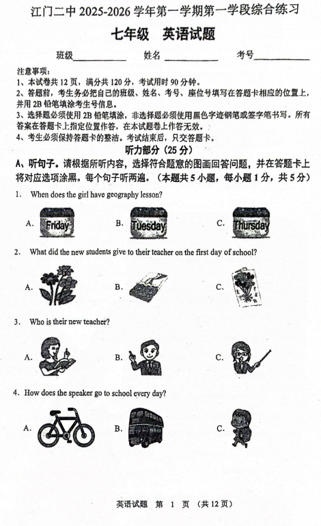 广东省江门第二中学2025-2026学年七年级上学期第一次月考英语试题