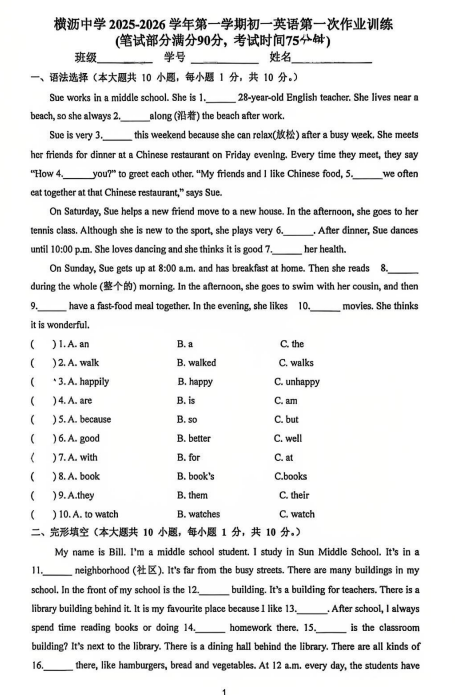 广东省东莞横沥中学2025-2026学年七年级上学期第一次英语月考试卷