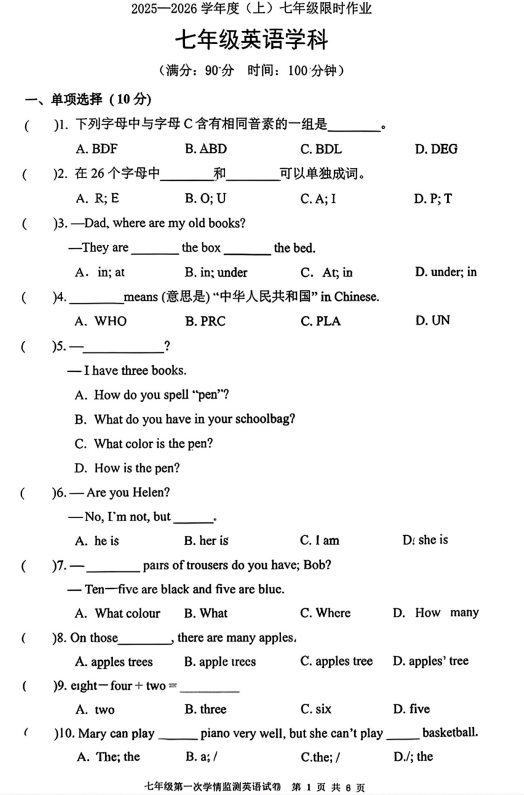 河北省唐山市龙华中学2025-2026学年七年级上学期第一次月考英语试卷