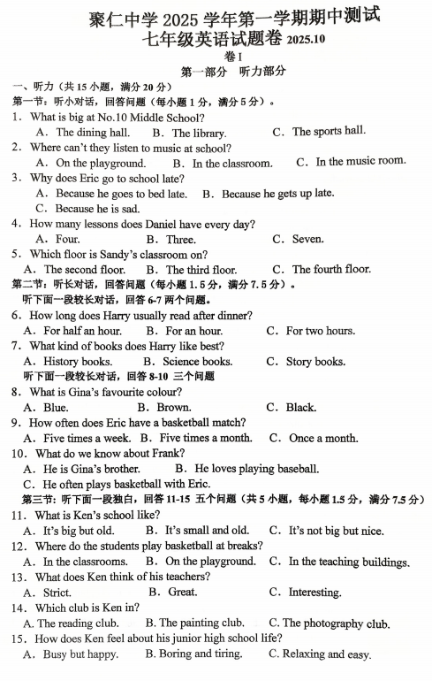 浙江省金华市兰溪市聚仁中学2025-2026学年七年级上学期10月月考英语试题