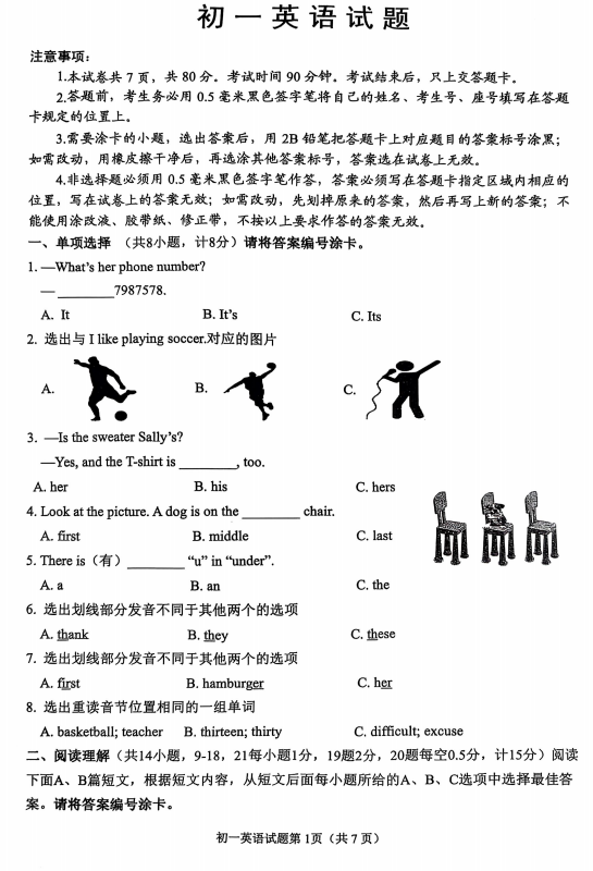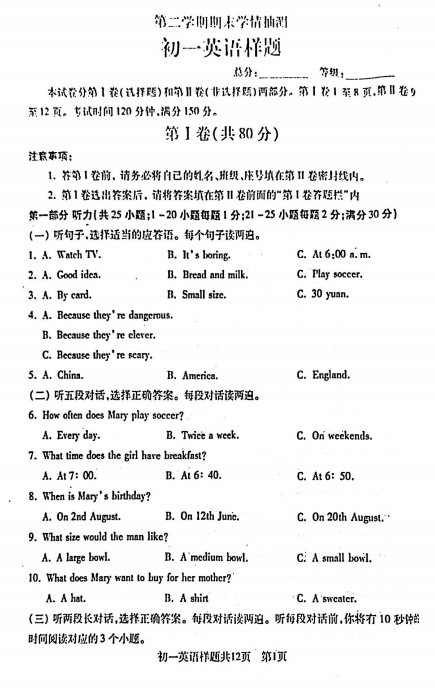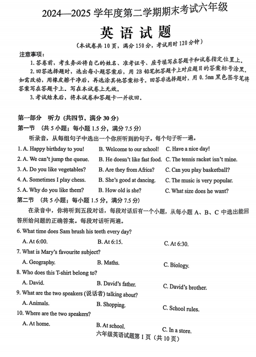 山东省泰安市泰山区2024-2025学年下学期期末考试六年级英语试题