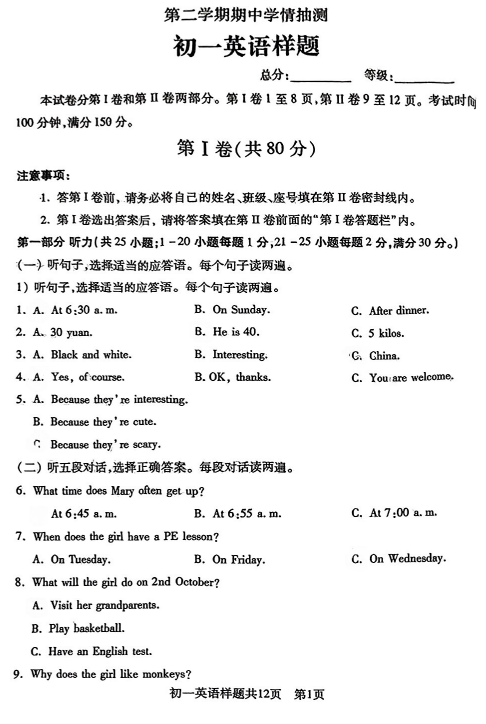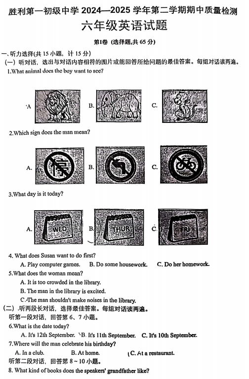 山东省东营市胜利第一初级中学2024-2025学年六年级下学期期中考试英语试卷