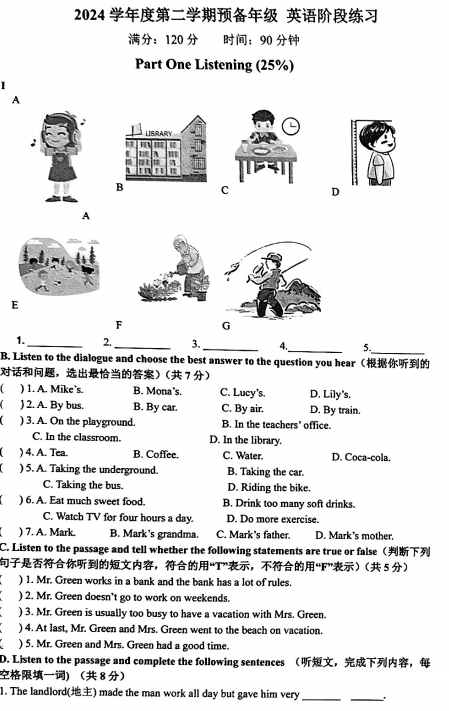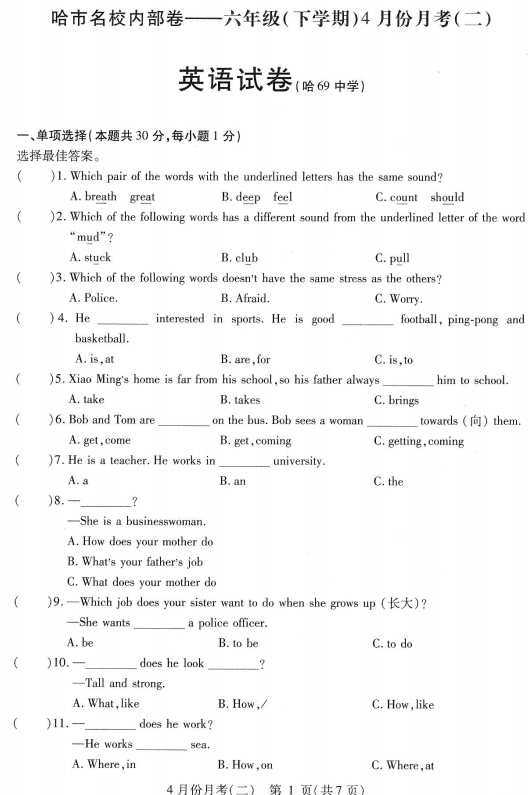 黑龙江省哈尔滨市第六十九中学2024-2025学年六年级下学期英语4月份月考试题