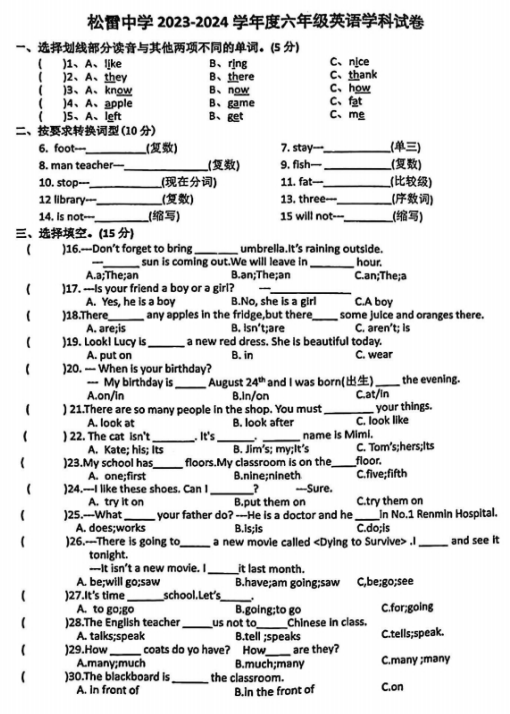 上海市民办杨波中学(五四制)2024-2025学年+六年级下学期3月月考英语试卷