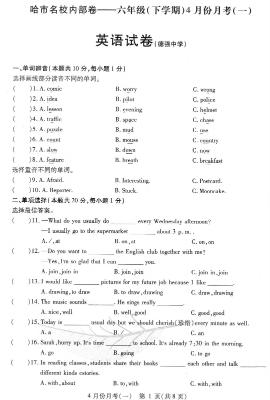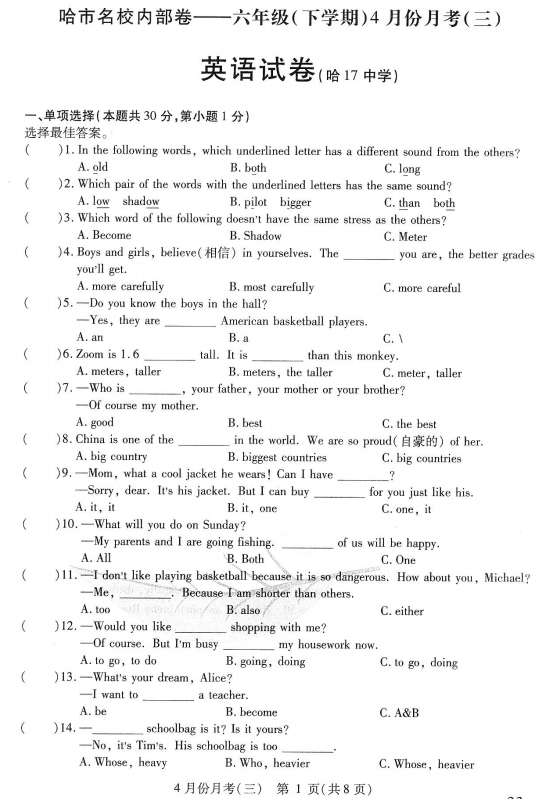 黑龙江省哈尔滨市第十七中学2024-2025学年六年级下学期英语4月份月考试题