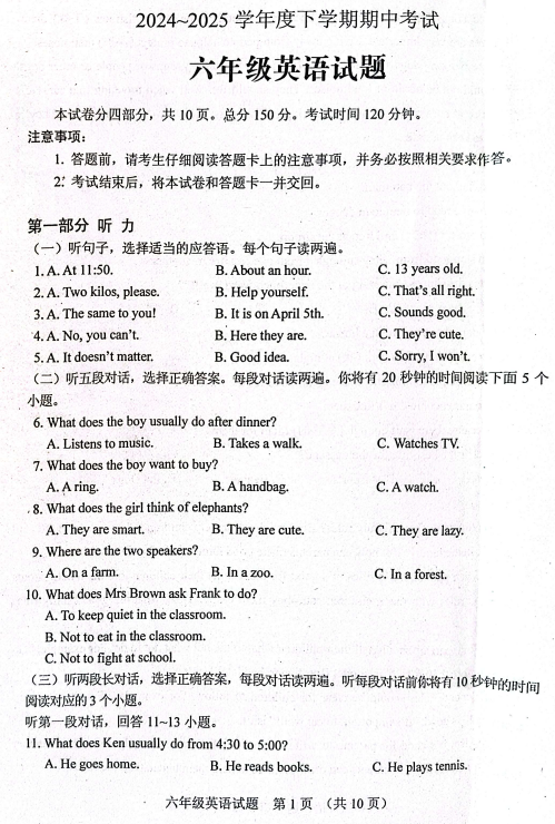 山东省泰安市肥城市2024-2025学年六年级下学期期中考试英语试题