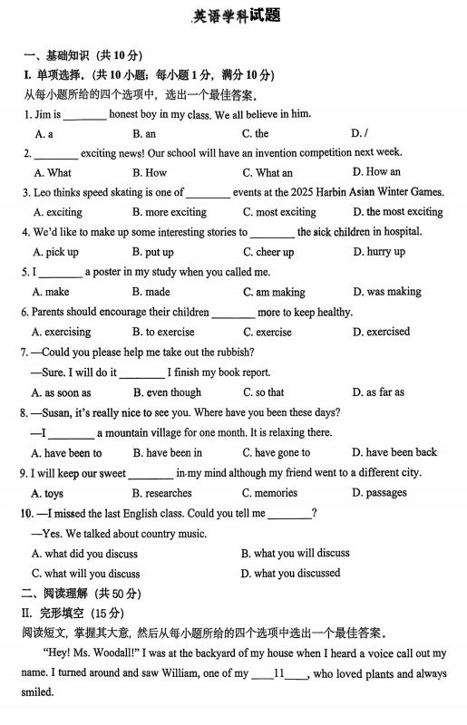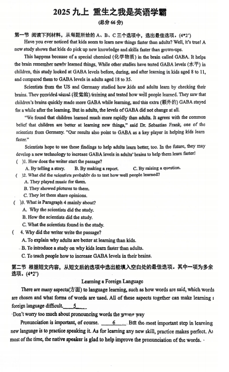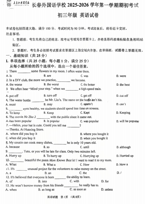 吉林省长春市外国语学校2025--2026学年九年级上学期开学考试英语试题
