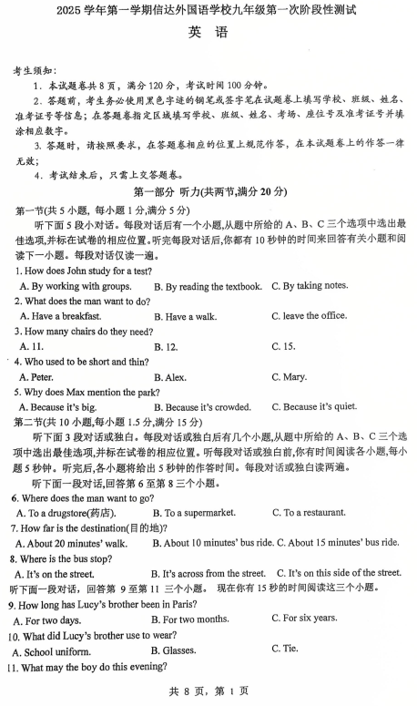 浙江省杭州市临平区信达外国语学校2025-2026学年九年级上学期开学考试英语试题