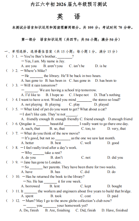四川省内江市第六中学2025-2026学年九年级上学期入学考试英语试题+
