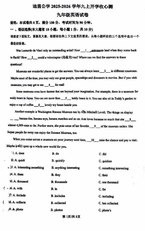 广东省中山市迪茵公学2025-2026学年九年级上学期9月份开学考英语试卷