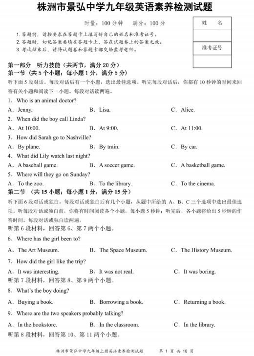 湖南省株洲市荷塘区景弘中学2025-2026学年九年级上学期开学考试英语试卷